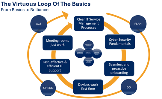 The Virtuous Loop illustrates how getting the fundamentals right—clear IT Service Management processes, proactive onboarding, reliable devices, and seamless meeting room experiences—creates a cycle of operational excellence. Each improvement reduces friction, minimises repetitive tasks, and lowers support overhead, which translates directly into cost savings without compromising quality.